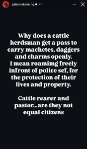 Nollywood actor Gideon Okeke has sparked conversation online after questioning why cattle herders are allowed to carry weapons like machetes and cutlasses openly, while outrage follows when a pastor is seen with what appears to be a gun.