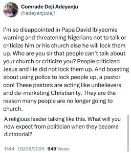 In response to the pastor’s comments shared on X (formerly Twitter), activist Adeyanju expressed his disappointment. He criticized the pastor’s threats to silence critics, comparing it unfavorably to the example of Jesus Christ. “People criticized Jesus, yet He never locked anyone up. I’m really disappointed in Papa David Ibiyeomie for warning Nigerians not to speak out or criticize his church, threatening to have them arrested,” Adeyanju wrote.